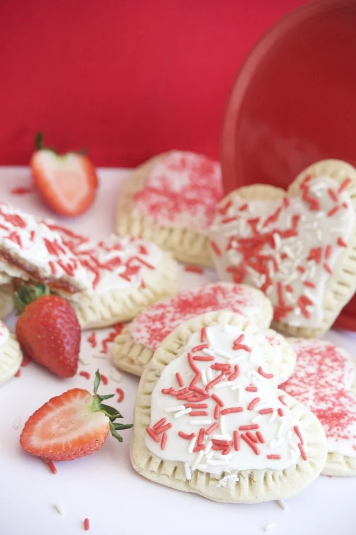 These gluten-free strawberry pop-tart cookies are soft, buttery, and tender with just the right amount of structure to hold a delicious, jammy and gooey strawberry center. They’re finished with a smooth vanilla icing and a shower of sprinkles, giving you that unmistakable Pop-Tart vibe—but in cookie form, and completely gluten-free! And bonus, they’re shaped like hearts, making them even cuter to look at.